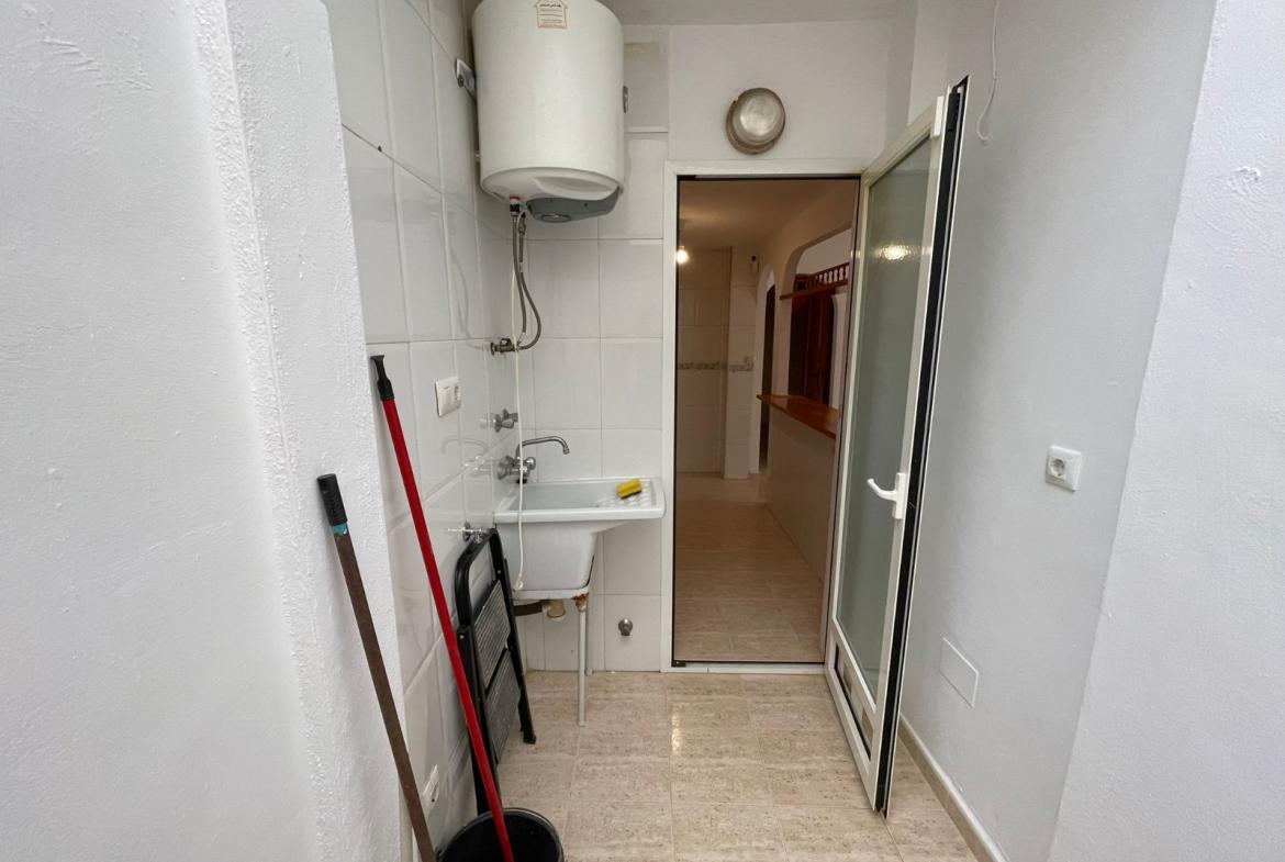 The property has two bright bedrooms and one full bathroom. The living room is comfortable and connects to an open-plan kitchen with a breakfast bar, making the space feel more open and practical. There is also an interior patio that provides ventilation and extra usable space.